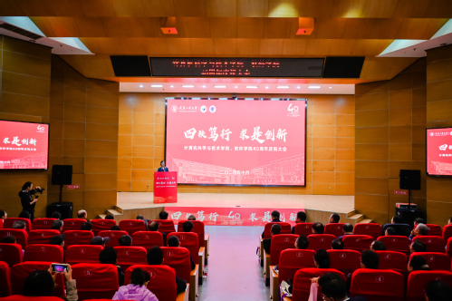 大会现场,播放了计算机科学与技术学院、软件学院40周年庆专题片,回顾了两个学院的办学历史,教学、科研等各领域发展情况。计算机科学与技术学院常务副院长杨勇、软件学院常务副院长王赜分别就两个学院的办学特色和发展规划等内容进行了详细介绍。